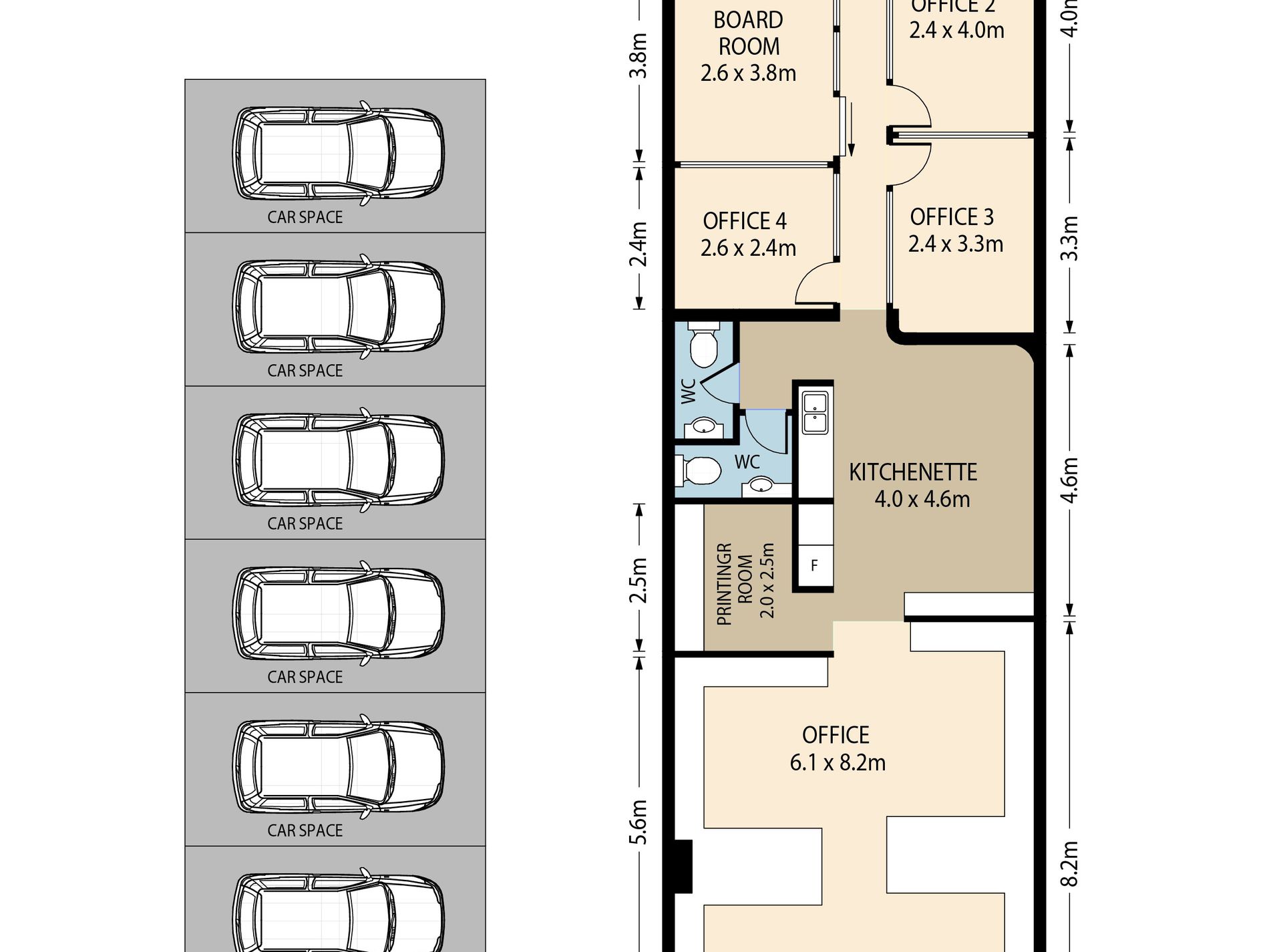 - Four (4) glass partitioned executive offices, reception, boardroom, kitchenette, large open plan office area with built in work stations, male and female amenities